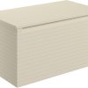 - Textured handleless furniture with soft horizontal fluted lines and a wrap around drawer box